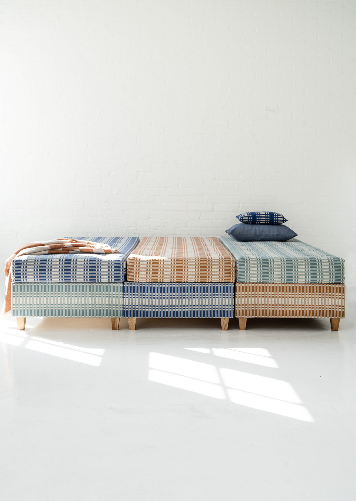 Tithonus leikittelee neliön ja raidan vuoroittelulla. Kuosi muistuttaa meitä yön ja päivän jatkuvasta syklistä luoden rytmikkään ja tasapainoisen kokonaisuuden – aivan kuten hyvä uni.