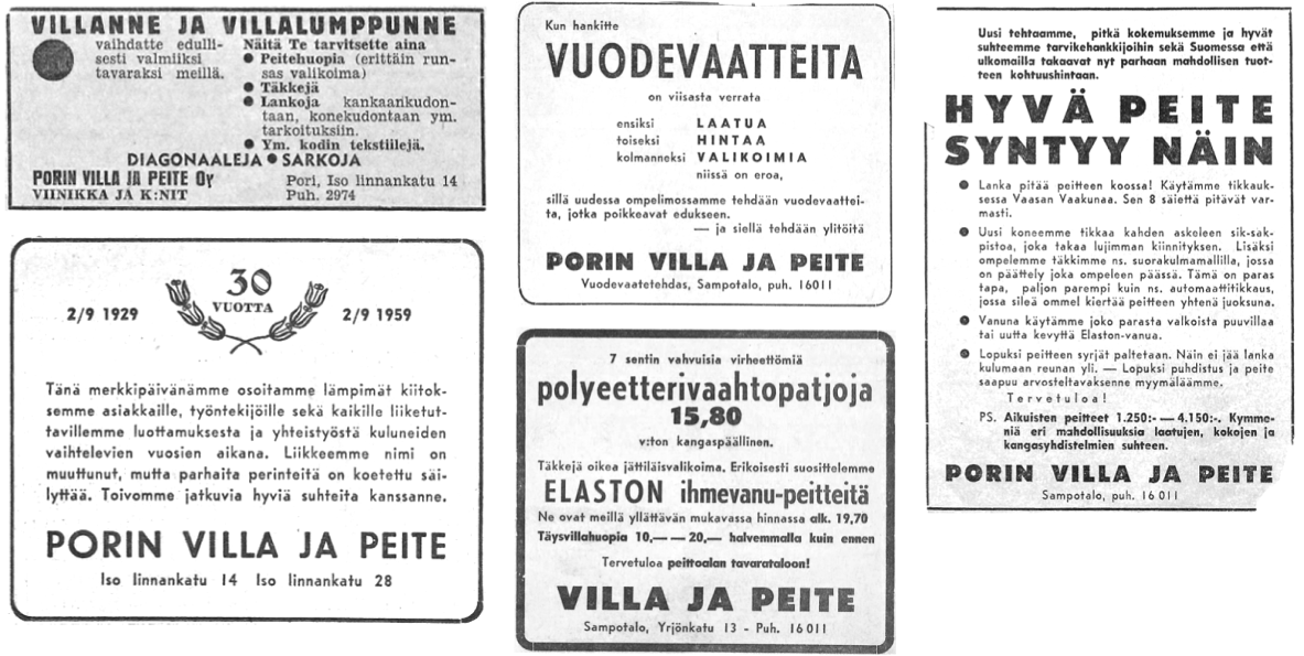 Sinne polkaistiin tekstiilitehdas. Siellä saksalaiset koneet ja porilaiset ihmiset tikkasivat täkkejä ja repivät nöyhtäistä flokkia patjojen täytteeksi. Ilma pöllysi. Ja nimikin vaihdettiin. Syntyi Porin Villa ja Peite.