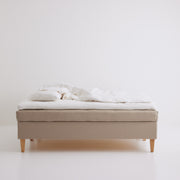 HUILI-sängynrunko toimii tämän paketin perustana. Klassinen ulkonäkö on viimeistelty käsin ja rungon vuoraus on villaa. Verhoilun päälikangas vaihtoehtoina on tummapellava ja hamppukangas. Patjat tulevat kelluvana rungon päälle luoden kerrostetun ja kutsuvan kokonaisuuden.